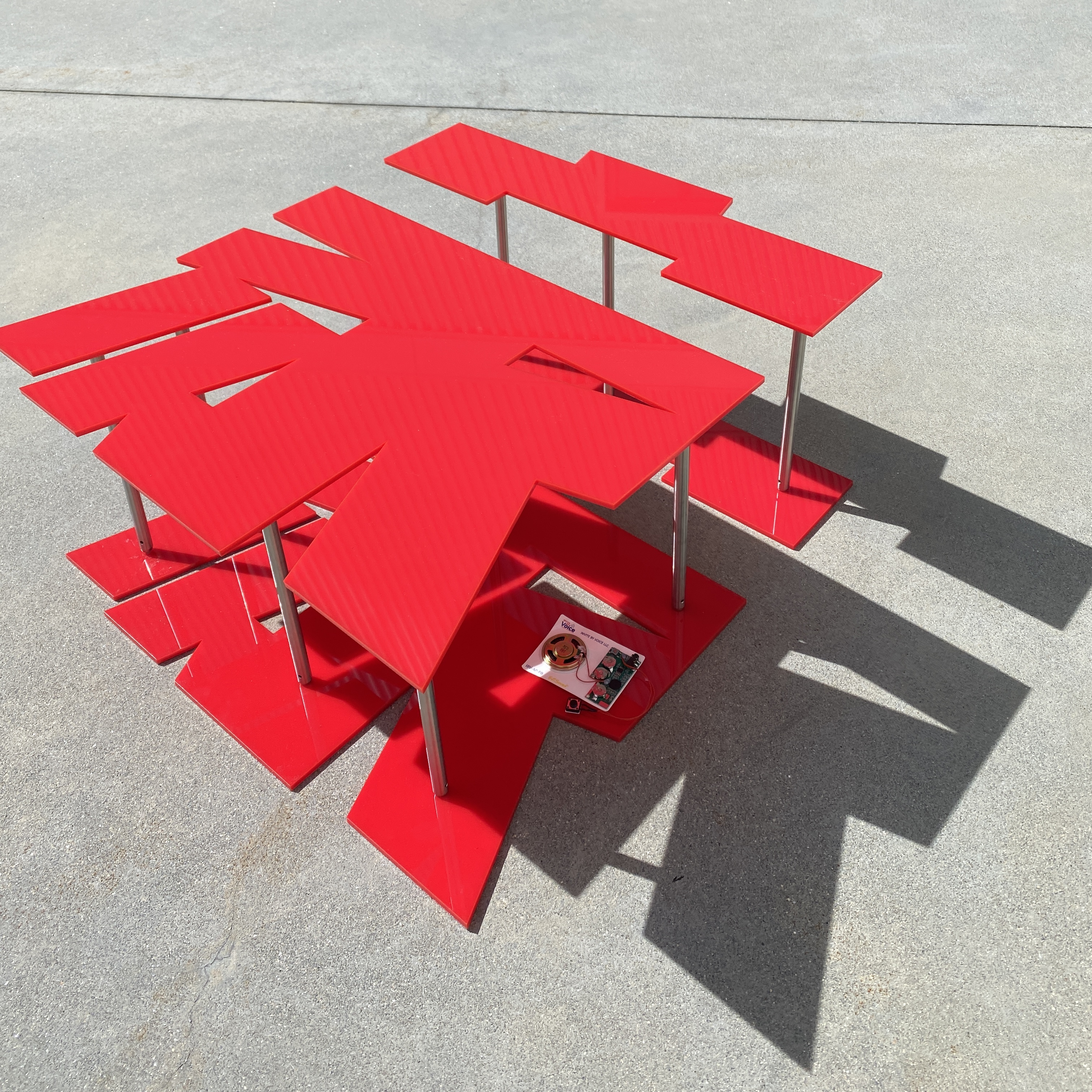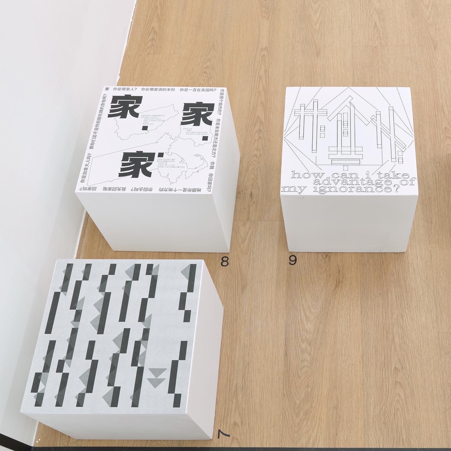 From 2D to 3D, the sculpture ‘Home(家)’ expands upon a poster I exhibited in the 2021 Radical Return exhibition. The flat Chinese character for “home” was recreated as a coffee table with audio output that allows people who cannot see to hear and/or touch the object. By hearing me read the poem I wrote in the original piece, I aim to defamiliarize tactile experience with raw material.